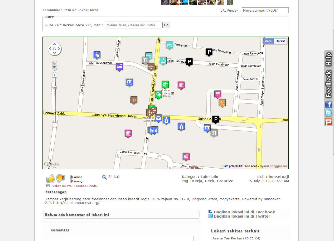 Malu bertanya pastilah sesat di jalan, kata-kata ini sangat cocok menggambarkan manfaat website Tanya jawab berbasis peta lokasi ini. Setiap pengunjung akan terhubung layaknya jaringan social dengan pengguna lainnya, agar sedapat mungkin membantu sobat lainnya yang sedang bingung dengan alamat atau lokasi.